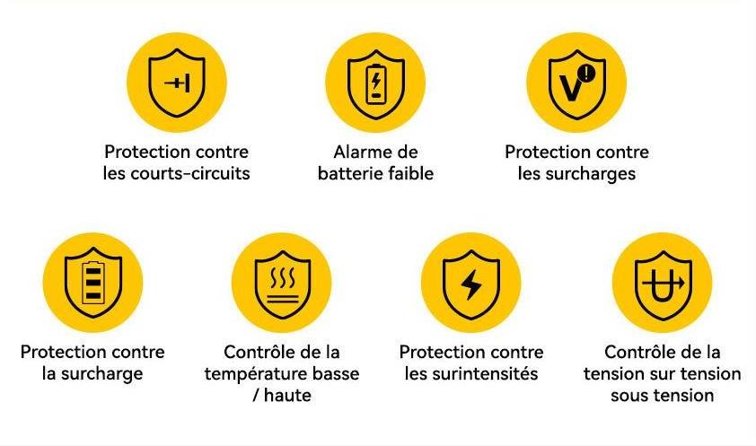 La technologie de protection de charge à 7 couches offre une sécurité complète pour les produits de batterie, prévenant efficacement les risques tels que la surcharge, la décharge excessive, les courts-circuits et la surchauffe. Il prolonge la durée de vie de la batterie et renforce la sécurité de l'utilisateur, ce qui vous permet de profiter d'une puissance durable en toute tranquillité d'esprit.
